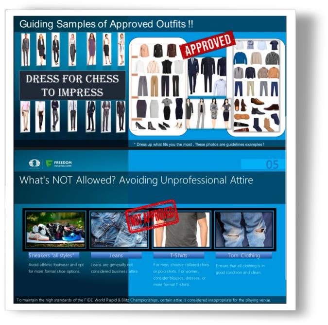 La Fédération internationale recommande le code vestimentaire "Smart Business Attire" bien connu des cadres occidentaux dans le milieu professionnel. Même si chacun sait que l'habit ne fait pas le moine, ce code alliant professionnalisme et confort permettrait "une expression individuelle tout en maintenant un certain niveau d'élégance constant".